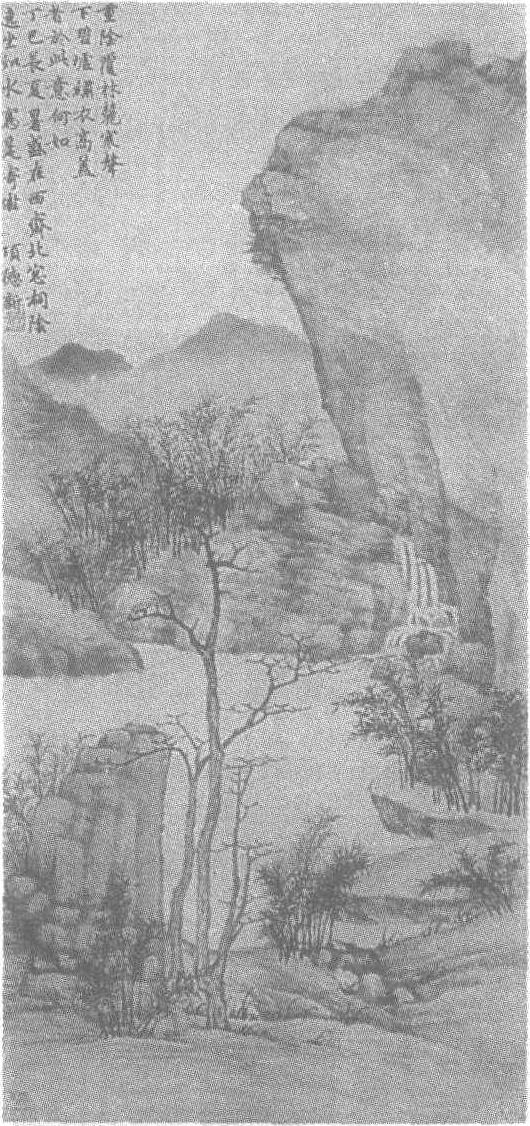 | 释义 | 项德新桐荫寄傲图轴明。项德新绘。纸本水墨。纵57.2厘米,横27.1厘米。北京故宫博物院藏。项德新(约公元1563—?年),字复初,明画家项元汴之子。工山水,得荆(浩)关(同)法,尤善写生。传世作品有《绝壑秋林图轴》、《乔岳丹霞图轴》、《仿王孟端竹石图轴》等。这幅图以湿润苍秀的笔墨成功地晕染了一幅意境迷离的山林景致:远岫平缓,近崖崔嵬,雾气沼沼,山泉跌荡。秀竹轻挺摇曳,沿岸伸向远方。溪边斜坡上,新篁簇簇,芳草稀疏。陡立的壁石旁,两株嘉树参天耸立。图的左上角有题署“垂阴覆林麓,寒声下碧墟,绣衣高盖者,于此意何如。丁巳长夏暑盛,在西斋北窗,桐阴绕坐如水,写是寄傲,项德新。”下钤白文<德新之印>。