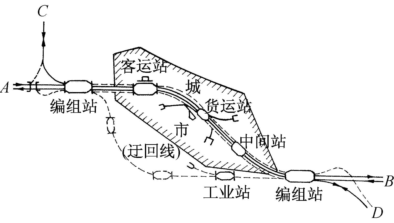 | 释义 | 顺列式枢纽junction-terminal with longitudinal layout of main stations又称“伸长形枢纽”。几个方向的铁路线路分别在枢纽两端汇合引入,并以共同轴线将两端相连,而编组站、客运站等主要专业车站沿着共同轴线顺序分布的铁路枢纽。根据城市、地区布局的差异,各地车流特征以及引入线路数目的不同,顺列式枢纽中的编组站可以集中设在一处,也可以分别设于枢纽两端;客运站、货运站、工业站等根据具体情况分布。该类枢纽的主要特点是有较长的共用线路经过城市,既为专业车站服务于城市创造了条件,但又会对城市产生一定的干扰。另外,当车流量过大,共同轴线上行车密度也很大时,将成为通过能力的限制环节。为解决上述对城市的干扰和通过能力紧张问题,可以选择包括采用先进信号设备、修建迂回线、将共同轴线建成3线、4线等措施予以缓和或疏解。