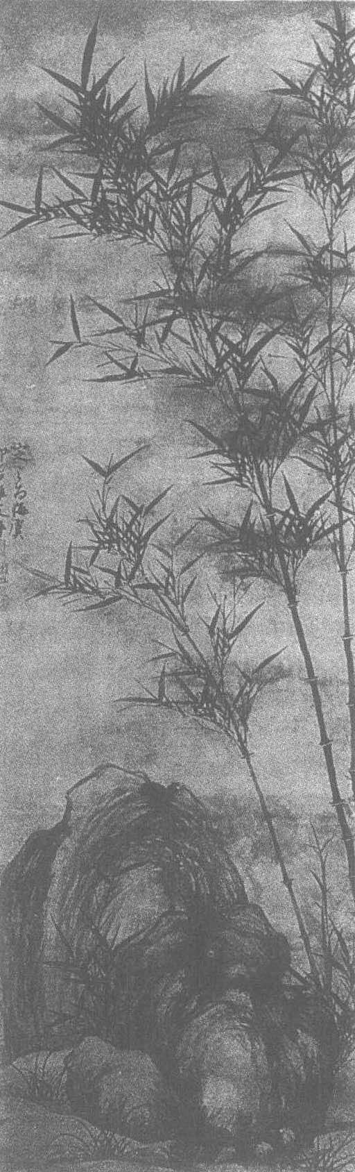 | 释义 | 顾安竹石图轴元。顾安绘。纸本墨笔。纵126.7厘米,横41.6厘米。北京故宫博物院藏。顾安(公元1289-1365年)迂讷居士,祖籍淮东(今江苏北部),家居昆山(今江苏),官至泉州路行枢密院判官。工行草书,擅画墨竹。所绘风竹,尤为精到。此图描绘几竿秀竹挺立石旁,竹干高直、细杈外展,竹叶以浓淡不同的墨色写出,疏密有致,层次分明。竹姿摇曳,新笋初生,显示出勃勃生机。山石以润笔皴染,圆实凝重,表面漫散着潮气。石隙中伸展出纤细柔嫩的竹枝,与高竹上下呼应。此图由淡墨烘染底色,衬托出一种清幽润淡的画意。画幅中作者自题:“定之为海虞柳居雅友作。”下钤〈顾安之印〉、〈迂讷老人〉二印。并钤有〈江村秘藏〉等鉴藏印。