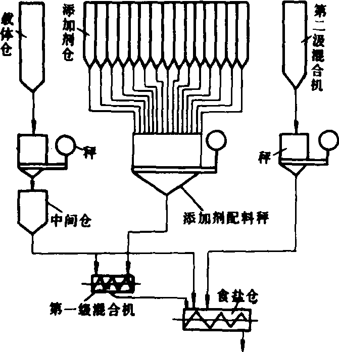 预混合饲料加工厂生产工艺流程 预混合饲料中的原料品种多,但各种成分在配合饲料中所占的比例极少(一般以毫克/千克饲料计),并须均匀分布在饲料中,故生产预混合饲料所采用的工艺和设备与生产配合饲料不同。它的建厂设计要求是:生产工艺力求简短,避免对制成品的再输送,并应及时包装,以免分级和交叉污染而影响质量;选用设备需效率高、残存少并耐腐蚀,对配料秤的精度要求高,误差应控制在0.05%以内,微量配料秤最好采用微机控制;对混合机要求混合均匀,变异系数不大于5%,卸料后的残存物不超过0.1%。 预混合饲料厂采用的一种工艺流程如图所示。载体仓内的载体粉料与添加剂仓内的添加剂各自称重后,部分载体与全部添加剂在第一级混合机内先进行稀释混合,再送往第二级混合机,加入余下的载体和成分含量较大的食盐后进行第二次混合,最后进行包装。两次混合可获得较高的混合均匀度,食盐部分也可在制作配合饲料时,直接加入配合饲料混合机内进行混合。 |