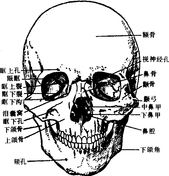 图487 颅骨(前面) 颅骨位于脊柱上方,除下颌骨和舌骨外,其余各骨借骨缝和软骨紧密相嵌,牢固连结成颅,可分为脑颅和面颅,前者由脑颅骨围成,容纳和保护脑;后者由面颅骨构成面部的支架,并围成眶、骨性鼻腔和口腔。 颅骨成人颅一般由23块颅骨组成,另外有3对听小骨位于颞骨内。除下颌骨和舌骨外,各颅骨相互连成一个整体。脑颅骨有8块,围成颅腔,容纳脑;面颅骨有15块,构成面部支架,容纳视觉、嗅觉和味觉器官。颅的上面有呈工字形的3条缝,缝在40岁后逐渐融合。 |