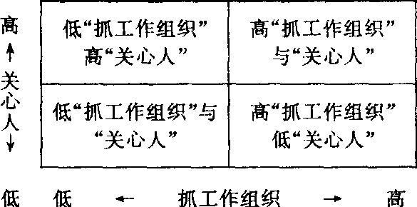 从领导者的行为方式来探索成功的领导模式。于本世纪40年代兴起。如美国俄亥俄州立大学把鉴别领导行为项目归纳为“关心人”和“抓工作组织”两个行为量纲,并设计了著名的领导行为四分图,如下:
