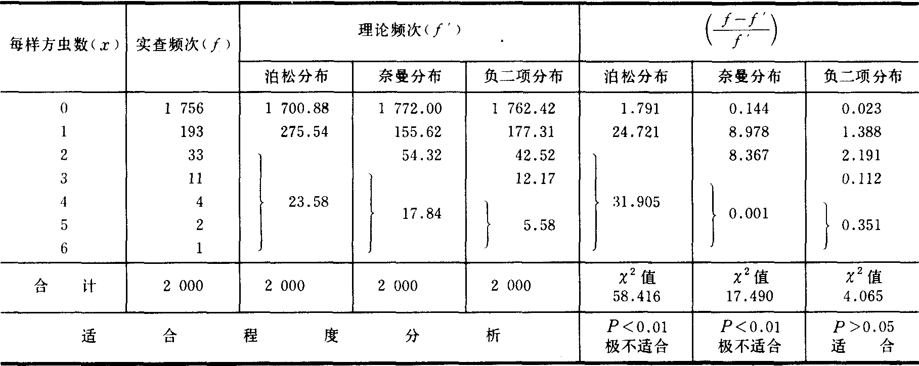 =0.162粒/株,S2=0.260 9,N=2 000 计算理论频次 将统计的分布信息代入各理论分布型的概率分布公式,计算其理论频次数(见种群分布型)。 x2适合性检验 将所求得的各理论分布型的理论频次,分别与实查频次作x2适合性检验。如计算所得的X2值的概率P>0.05,则表示此理论频次与实查频次相符合,便可认定所查的种群空间分布型属于此种理论分布型。如将表1实查资料作3种理论分布型的X2检验,得表2。 表2 各理论分布型理论频次X2检验