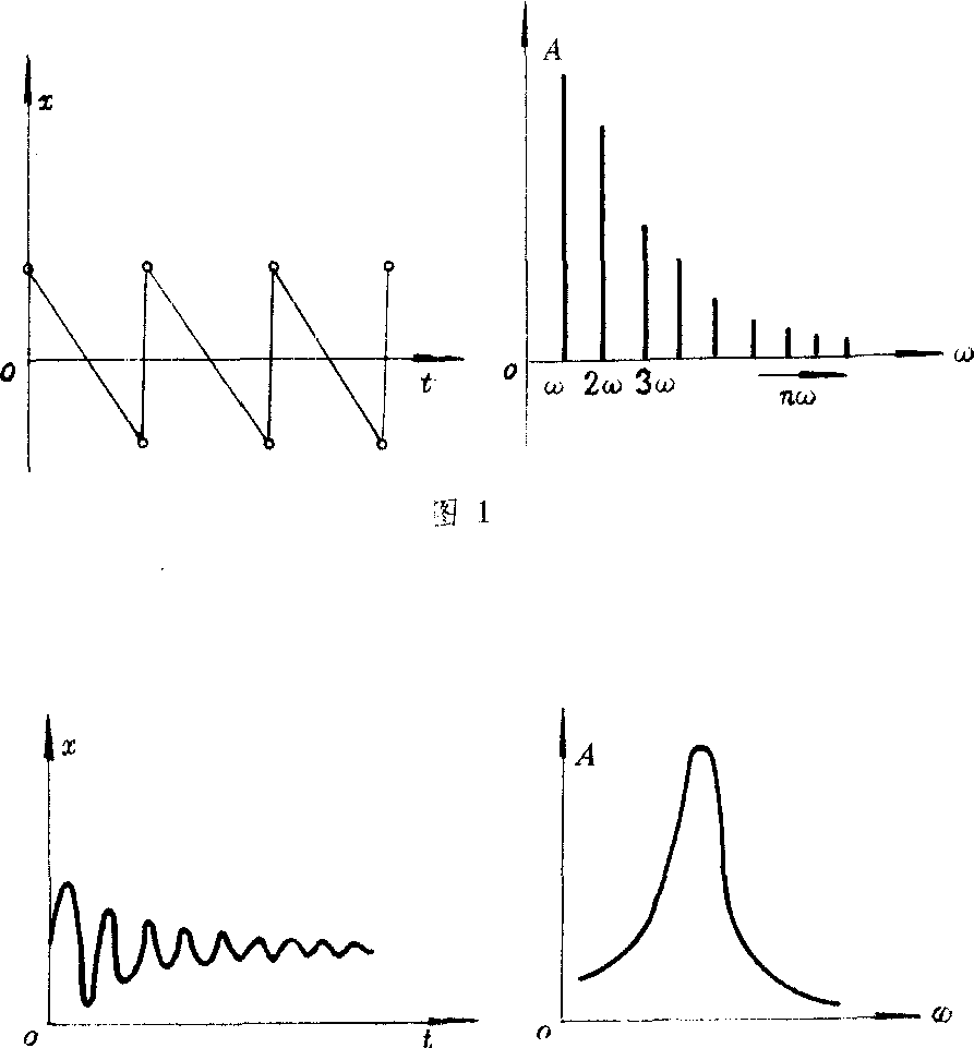图2 图1表示锯齿形振动及振动谱。图2表示阻尼振动及振动谱。把复杂的机械振动分解成的频谱称为机械振动谱,把声振动分解成的频谱称为声谱,把光振动分解成的频谱称为光谱,把电磁振动分解成的频谱称为电磁波谱,一般常把光谱包括在电磁波谱的范围之内。分析各种振动的频谱就能了解该复杂振动的许多基本性质,因此频谱分析已经成为分析各种复杂振动的一项基本方法。 频谱为了显示实际振动所含分振动的频率与振幅之间的关系,将各个分振动按其频率的大小排列而成的图象。在频谱中,横坐标表示分振动的圆频率,纵坐标则表示振幅。把复杂振动分解为频谱,在声学、无线电技术、光学等方面都很重要。 |