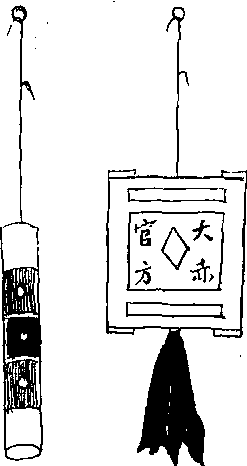 此幌为字幌,幌框为黄色,幌心为白色,在其中间贴一菱形纸,四周题字,以此来作其行业的标记。另有用红、绿、蓝三色布卷制而成者。