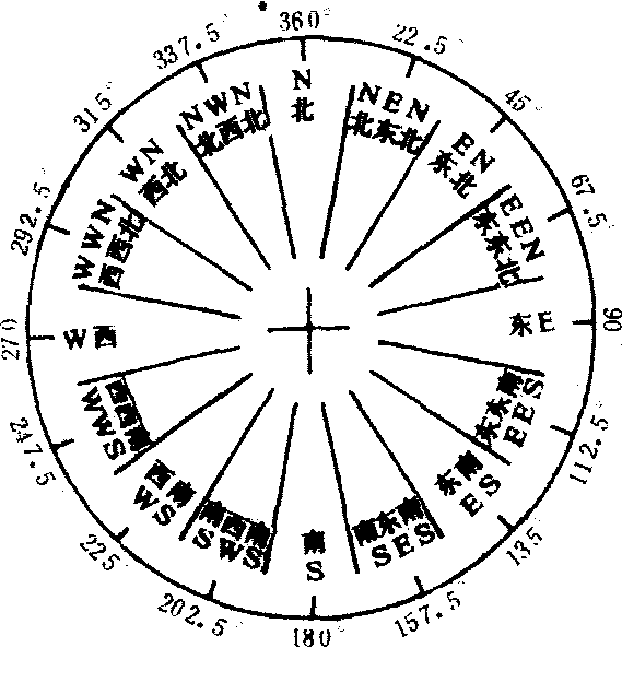| 释义 | 014 风民歌。《诗经》中所收的“风”,原为周初至春秋中期流传在周南、召南、邶、鄘、卫、王、郑、齐、魏、唐、秦、陈、桧、曹、豳等地区或诸侯国的土风歌曲,又称“国风”或“十五国风”。孔子时,尚可“弦歌之”,即用琴、瑟一类乐器伴奏着歌唱的。后乐谱失载,曲调渐渐流散民间。魏、晋以来的所谓“《诗》乐”,皆后人托古“自作声节”,已非“风”的音乐直传。今存仅歌词160篇,从其文字推知,“风”中常用的曲式有:一个曲调的多次重复,或前加引子,或后带尾声,或引子、尾声兼用,或只作“换头”变化;两个曲调联成一曲或双双循环、变化重复等。 风feng空气的水平运动。风是一个向量,因而包括风向和风速。风向是指风的来向,例如,北风就是指空气自北向南流动。风向一般用十六方位表示,也可以用方位角表示 (见图)。内圈是各个方位,外圈是与方位对应的方位角。