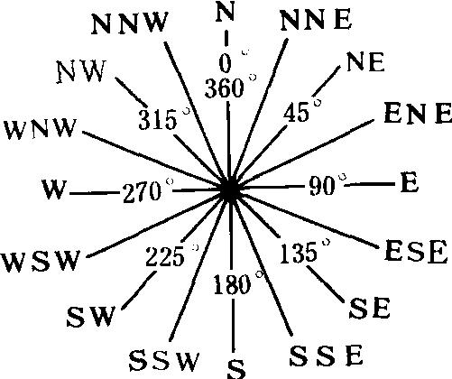 图 1 风向16方位 风的变化 风向风速是随时间、空间变化的。气流的湍流性造成风的脉动和阵性; 在一个地点的分布状况常用玫瑰图表示(见图3)。 风向、风速 总是在不同的程度上脉动地变化着,风的脉动特性是由气流的湍流性引起的。如图2所示。强湍流所引起的风的急剧变化叫风的阵性。在强风暴或热带气旋中,地面上个别阵风的风速可达100米/秒。记录到的最大瞬时风速为103.2米/秒, 出现在1934年4月12日美国华盛顿山(Mt. Washington)海拔1010米处。在对流层上部的急流中,风速可达到150~200米/秒。地面上小区域和短时间内也可以出现完全的静风。 风的垂直分量对天气变化能起重要的作用。在强对流的情况下, 垂直风速可超过10米/秒,而在大尺度系统中的平均垂直风速只有每秒几厘米。