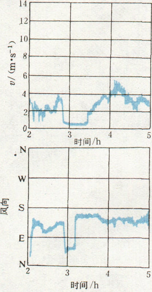图 2 风的脉动特性 在近地层, 风随高度的变化接近对数的关系。测风仪器虽不能置于标准高度10米处, 但在安装条件达到“开阔”的要求 (即风速表离障碍物的距离至少是障碍物高度的10倍)时,高度为h处的风速与10米高处的风速的关系可近似地用赫尔曼(Hellman)公式的简化形式来表示, 即: υh=υ10〔0.233+0.656 lg (h+4.75)〕 式中υh为h(米)高度处的风速, υ10为仪器安装在标准高度10米处的风速。阵风及阵风分量 风在短时间内的急剧变化。在一定时段内风速偏离其平均值的一个正的或负的偏距, 其持续时间不超过2分钟即称为阵风。其在某一规定方向(如水平方向、垂直方向)的分量称为阵风分量。当阵风风速超过20米/秒时, 常带来大的破坏性。这种突然发作的强阵风称为飑。飑的持续时间短促,特征是风速突增、风向突变, 其他气象要素也有剧烈变化(见飑线)。