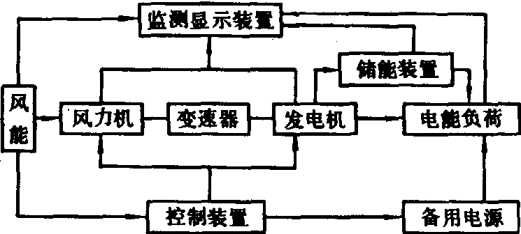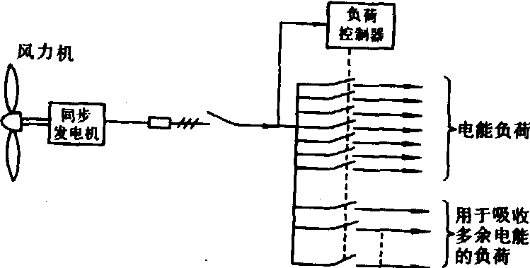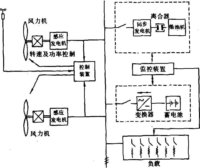 图4 具有负荷调节的独立运行风力发电系统 联网运行的风力发电系统 这种运行方式不存在由于风的随机性而带来的储能问题。中、小容量直至大容量(1000千瓦以上)的风力发电机组皆可采用这种运行方式。联网运行的方式有两种:一种是恒速恒频,即风力发电机组的转速不因风速的波动而变化,从而能维持输出恒定频率的交流电。这种方式简单可靠,是普遍采用的,其缺点是不能充分地利用风能,因为风力机只有在一定的叶尖速比下才能达到最高的风能利用率。另一种方式是变速恒频,即风力发电机的转速随风速的起伏作变速运转,通过在发电机端配置特殊功率电子装置以获得恒定频率的交流电。这种方式比较复杂,其优点是可以提高风能的利用率,因此成为发展的方向。采用这种方式必须注意解决由于变速运行而在机组及其支撑结构上出现的共振现象。 集群式风力发电场 在风能资源良好的地区将数十台、数百台或数千台单机容量为数十千瓦至数百千瓦甚至1000千瓦以上的风力发电机组按一定的阵列布局方式成群按装,即可组成集群式风力发电站(或称风电场)。这是一种大规模开发利用风能的有效形式,有利于降低风力发电设备投资费用及发电成本。 风电场内风力发电机组的排列方式目前仍处于研究阶段,已经建造的风电场所遵循的原则是在平坦地面上,机组按矩阵分布排列,机组沿盛行风向前后间距离约为机组风轮直径的7~10倍。与盛行风向垂直方向上机组间距离约为风轮直径的1.5~2倍;在地形起伏不平的地面上,机组在等风能密度线上按装,机组之间的距离比在平坦地形上的要小。在地形复杂的丘陵或山地,除按以上原则考虑风力机尾流的影响外,还要考虑地形造成的端流的影响。 风力机、柴油机联合发电系统 可以实现稳定持续的供电,具有两种不同的运行方式,即切换运行及并联运行。切换运行是风力发电装置及柴油发电装置在机械上及电气上无任何联系,有风时由风力发电机供电,无风时由柴油发电机供电。并联运行则是风力发电机与柴油发电机在电路上并联后向负荷供电(图5)。这种运行方式在技术上比较复杂,当风况及负荷变化时需及时调节风力及柴油发电机的出率并维持系统的稳定,同时应尽量降低柴油机的起动与停机的次数及轻负载下运转。采用短时蓄电池储能或配备储能飞轮,可以减少柴油机起停次数。
