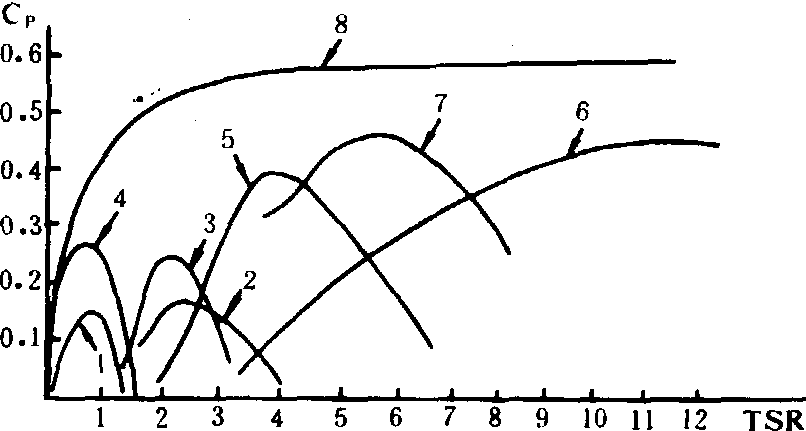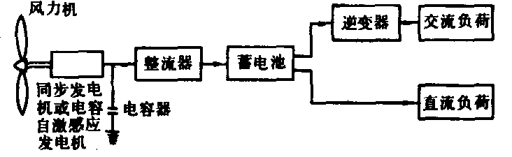 图2 风力机功率系数与叶尖速比的关系 1.隆波尼乌斯型;2.荷兰4叶片式;3.自行车轮式;4.美国多叶片式;5.达里厄型(Φ)型;6.2叶片高速螺旋桨式;7. 3叶片螺旋桨式;8.螺旋桨式风力机理论效率 风力发电的运行方式 风力发电的运行方式分为独立运行、联网运行、组成集群式风力发电站(或称风电场)运行、风力-柴油联合发电系统运行等。 独立运行的风力发电系统 适用于偏远农村、牧区、沿海岛屿、边防哨所、气象台站、电视差转站、导航灯塔等电网达不到的地区。微型及小型风力发电机组多采用蓄电池储能再向负荷供电。如负荷需要交流电,则在蓄电池与负荷之间加入逆变器(图3)。在容量较大的独立运行系统中,不采用蓄电池储能而采取负载开关控制器,按风速变化自动接通与断开负荷(图4),在这种运行方式中,负荷按供电的重要性分类。重要的负荷应保持连续获得电能,次要的负荷则不断地接通与断开,以适应风力机输出能量的变化。