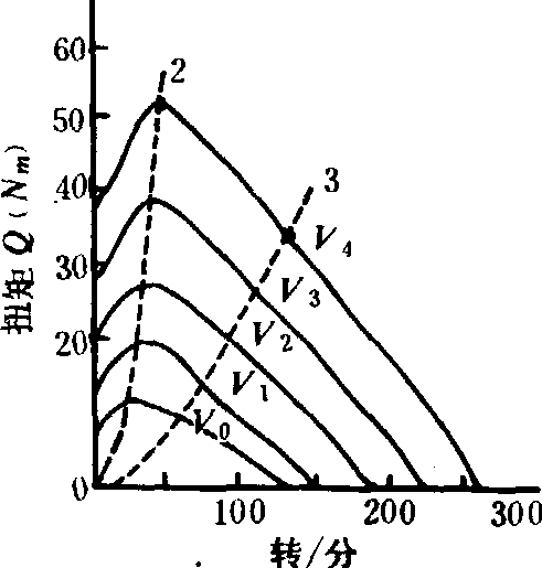 图5 不同风速时,风力机的扭矩特性曲线 由图可知:❶最大功率随风速增加而增加,如图5上的虚线3所示。 ❷最大扭矩随风速增加而增加,如图6上的虚线2所示。 ❸同一风速下风机最大扭矩时的风翼转速将低于最大功率时风翼的转速, 如图5上风速为v4时的3点和2点。2点为最大扭矩的点, 即此曲线上所得最大斜率的点。功率、扭矩和转速之间将有如下的关系: