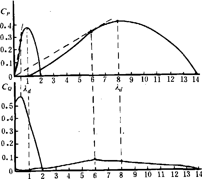 不同风力机的动力特性曲线必将随着风速(v)、风轮半径(R),甚至空气密度(ρ)的不同而变化。为了解不同尺寸的风轮在不同风速下的变化特性。人们将功率、扭矩和速度都化为下列无量网表达式: 功率系数: 扭矩系数: 翼尖速比: λ是确定各类风力机的一个重要参数。计算出不同风力机在不同风速下的λ值和功率系数CP值和扭矩系数CQ值,便可绘制成CP-λ关系的特性曲线,和CQ-λ的关系的特性曲线。图6是一台低速风力机(设计λd=1)和一台高速风力机(设计λd=8) CP和CQ随λ的变化的特性曲线。图上清楚表明,它们最大功率系数相差不大,但无论起动扭矩,还是最大扭矩都有明显差别。 在实践中,根据翼尖速比,风力机可采用的翼片数目如下: