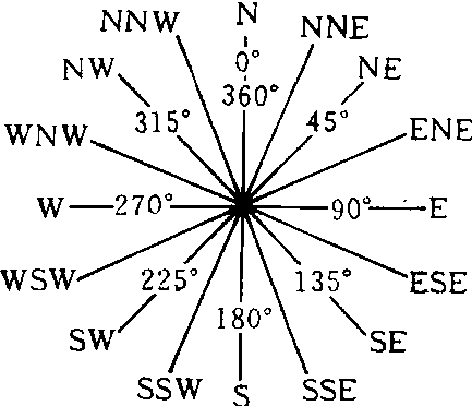 风向16方位 风向全省各地的风向,具有明显的季节变化。冬季盛行偏北风,夏季盛行南风,春、秋二季为冬夏季风交替时期,风向变化较大,但以偏北风的频率最大。一地的最多风向与山脉、河流的走向有密切的关系,就全年来看,洞庭湖多北风和东北风,岳阳北风频率占24%,东北风频率占27%。溯澧水而上,风向多偏东风(大庸东风频率占24%); 溯沅水而上,沅陵、芷江多东北风 (沅陵占32%,芷江占31%); 溯湘江而上,长沙多西北风(频率为35%),衡阳、永州多东北风 (衡阳频率为25%,永州为31%); 沿资水而上,在安化多北风(频率占20%),邵阳多东北风(频度为19%)。郴州一地多北风(频率为24%)。 风向风的来向。常以16个方位和静风表示,以拉丁文缩写字母表示,即北(N)、北东北(NNE)、东北(NE)、东东北(ENE)、东(E)、东东南(ESE)、东南(SE)、南东南(SSE)、南(S)、南西南(SSW)、西南(SW)、西西南(WSW)、西(W)、西西北(WNW)、西北(NW)、北西北(NNW)。静风(C,风速<0.3 m/s,风向标不动)。按16个方向记: |