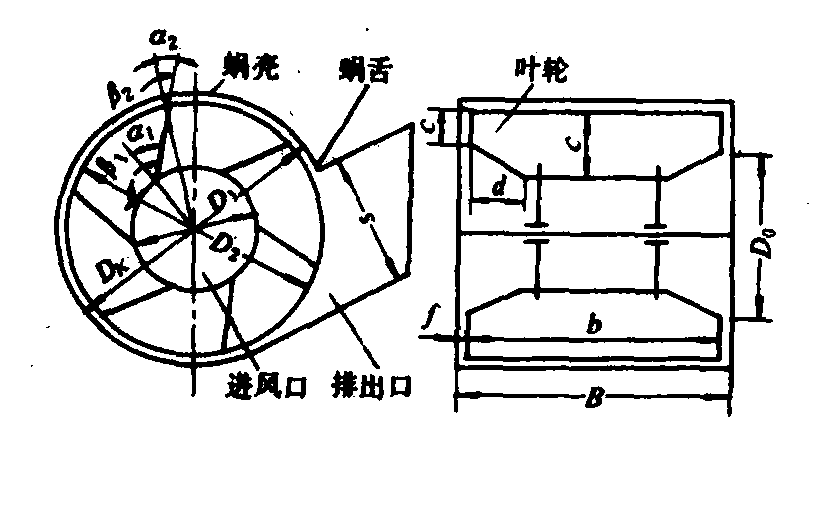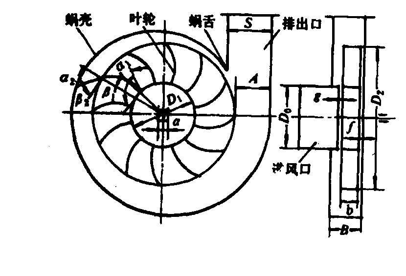 图1 离心风机简图 轴流风机 一种大流量的低压风机,结构如图2。其基本原理是:气流经旋转的叶轮提高压力和速度后,沿轴向流出。其性能与叶片形状、叶片安装角、叶片外径与壳体的间隙大小等有关。叶片的形状有等厚度圆弧叶片和如飞机机翼的翼形叶片等。翼形叶片的空气动力性能较好,而圆弧叶片结构简单,容易制造。轴流风机除壳体与叶轮外,还可设置集流器、出口扩压器和进出口导叶等。集流器可使进气速度场均匀,从而提高风机效率;出口扩压器可使流出出口导叶气流的部分动能转换为压力能,获得较高的压力。轴流风机按其导叶的设置可分为三种结构型式:❶不设导叶的风扇式轴流风机,由于能量损失大,效率较低,仅用作低压风机; ❷设有出口导叶的简易筒式风机,由于气流从叶轮获得的圆周分速度在出口导叶中转换为轴向速度,减少了能量损失,提高了效率; ❸设有进口导叶的简易筒式风机,由于气流在进口导叶处加速,使叶轮中气流相对速度增高,可获得较大风压,但能量损失大。
