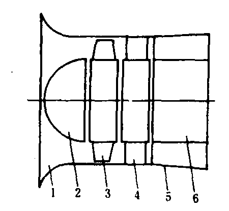 图2 轴流风机筒图 1.集流器;2.整流罩;3.叶轮;4.出口导叶;5.出口扩压器;6.导流体 在农业机械中,轴流风机多用于植保机械、温室、谷仓、禽畜舍的通风干燥设备等。植保机械用轴流风机要求体积小、重量轻,并有较高的出口风速以获得较远的射程。 |