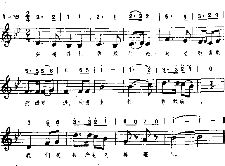 | 释义 | 乐段结构Yueduan jiegou乐段是音乐作品中能表达出完整乐思的最小曲式结构。它可以构成独立的乐曲,也是各种类型的大型曲式的结构基础。因此,掌握各种形态的乐段写作方法是歌曲创作中的一个很重要环节。在歌曲作品中,曲调部分的乐句、乐段和歌词部分的句、段有一定的对应关系,但由于在歌曲作品中的音乐部分和歌词部分都有相当大的灵活性和伸缩性,因此当两者结合在一起时,其变化是无穷无尽的,并没有一个必然的模式可以遵循。例如《中国少年先锋队队歌》的最后一段,原歌词应该是“向着胜利勇敢前进,我们是共产主义接班人”,曲作者谱曲时不是简单的将其处理为两句结构的乐段,而将“向着胜利勇敢前进”一句歌词反复了3次,使音乐部分扩大为一个4句结构的乐段。如果没有音乐的配合,这样的词句重复就会失去诗意,但配上曲调后,唱起来就觉得很自然,并且由于曲作者对“向着胜利”4字作了刻意的处理和渲染(第一句中的“向着胜利”处理成坚定的,第二句表现出阻挡不住的冲动,第三句则是辉煌的)(见下例),深化了歌词的主题而使其升华到一个新的意境。又如《我爱北京天安门》在整体结构的布局中用同一首歌词反复3次,处理成一个3段体的歌曲,而在局部性的乐段结构中,都是用两个乐句组成的乐段概括了句歌词组成的段落,每一乐句对应着2句歌词。