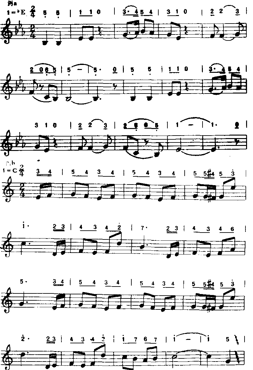 构成乐段的乐句的数目、长度和结构形态(是否再细分成乐节或动机等)都设有必然的模式。别的书中所提到的“两个动机组成乐节,两个乐节组成乐句,两个乐句组成乐段”的格式只是在17至19世纪中西欧的某些音乐作品(特别是舞曲风格的作品)所用的曲式结构,不能将它作为一种定式,以免束缚住对创作的构思(并不排斥将这种格式作为曲式结构的一种样式在创作中使用)。在一个乐段中,各乐句用不同的终止式加以区分,当乐段结构用作独立的乐曲时,把最后一句一般结束在主音; 如将乐段作为较大的曲目的一个结构段落时,最后的一个乐段应该用完全终止,前面或中间部分的乐段可用全终止也可用半终止作为结束 (用半终止结束的乐段称为开放性乐段)。由一个乐句构成的乐段给人以不平衡的感觉,所以较少使用,有时,乐段内的乐句划分不一定十分明显,而是若干结构比较小的乐节直接组成乐段(如河北民歌《小白菜》)。由2个乐句构成的乐段能够体现出起、落;问、答或呼、应关系,比较完整,因此较常用,按其乐句间的关系可分为重复结构和非重复结构2类,重复结构乐段的两乐句基本重复或变化重复,两句的终止式不同;非重复结构乐段又可分为对比性结构(两乐句形成对比)和延展性结构(一种对比性不强、后乐句基本保持前乐句的旋法和节奏处理手法的结构)两种类型。由3个以上的乐句构成的乐段称为多句结构乐段,在多句结构乐段中,4句结构乐段较常用。在4句结构乐段中,常在第3句形成对比,使音乐的展开形成启、承、转、合的结构逻辑。当多句结构形成为2个乐段并且2个乐段为重复结构关系时,就形成“复乐段”,复乐段和单乐段的区别主要在于是否能形成合乎乐段结构的2个段落,而不在于每个乐句的长度。如下例a《七色光之歌》和例b《蓝精灵之歌》,两者的长度均为16小节,但《七色光之歌》每8小节为1乐句,整体结构为重复的2句结构,而《蓝精灵之歌》则是4小节为1乐句,前8小节和后8小节均各自形成为1个2句结构的乐段,而两个乐段呈重复关系,所以属于复乐段结构。