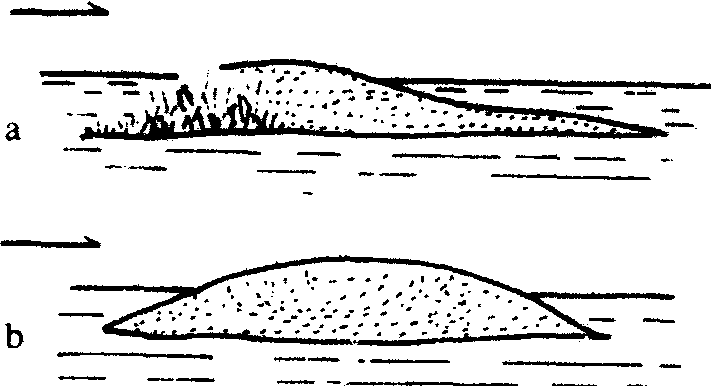 指被风搬运的沙粒,在一定条件下堆积而成的各种沙体形态,为干旱区地貌组合的重要类型。根据其成因和形态特征可划分为以下几种地貌类型: ❶沙堆: 当风沙流遇到障碍物时,风速减弱,在背风坡产生涡流,使砂粒在背风面堆积而成。其高度不超过10米,长数十米至数百米,大小不等,形态各异。当开始气流未完全受障碍物阻滞,两侧间形成与轴向垂直的涡流,将沙粒卷入其间,使沙堆沿风向伸展,形成平行于风向的蝌蚪状沙堆(图1.a)。在风不断地吹拂下,沙堆不断扩大,自身变成风沙流的很大障碍,使砂粒堆积增多,形成盾状沙堆(图1. b)。