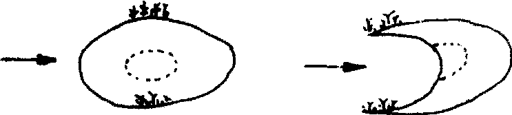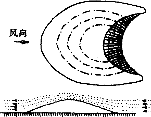 ❷沙丘:盾状沙堆进一步发展,加剧了地形的起伏,影响近地面气流的运行,在迎风坡丘顶的风速大于背风坡坡脚,背风坡产生涡流,使之成为浅小的马蹄形凹地,而沙粒被涡流带至凹地周围则开始出现沙丘的两翼,随着沙粒的继续供给,沙丘逐步增高,背风坡凹地进一步扩大,则形成丘体中部宽厚,两翼尖小,迎风坡凸而缓,背风坡凹而陡,两坡不对称并顺风向延伸,形似新月,称新月形沙丘(图2)。如果沙堆两侧有植物生长,在沙丘移动过程中,边缘部分受植物所阻,移动速度较缓,而中部受风力作用较强,移动速度较快,则形成迎风坡凹进,而背风坡凸出,丘体两翼指向风之来向,因形如抛物线形,称为抛物线沙丘(图3)。在风速较大地区,中部沙丘拉长,形成发针形沙丘。当两个风向相反而风力不等的风交替作用时,在有草丛和灌木生长的情况下,弯曲的沙梁的两侧发育有凹下的沙窝,构成梁窝状形态,称为梁窝状沙丘,在我国新疆古尔班通古特沙漠的西南部较为典型。在两个近于相互垂直的风向中,主风向形成沙丘链与次风向形成低矮的沙埂,纵横交错,形似格状,称格子状沙丘。在多种风向而且风力均衡条件下,形成一种由一群四周高、中间低的圆形或椭圆形沙窝所组成的沙丘,形似蜂窝,称蜂窝状沙丘。在多种风向且风力相差不大的情况,或气流遇到山地阻挡,形成巨大旋涡,把沙粒吹扬并堆积下来,形似金字塔,称为金字塔沙丘,在非洲撒哈拉沙漠和我国塔克拉玛干沙漠可见。