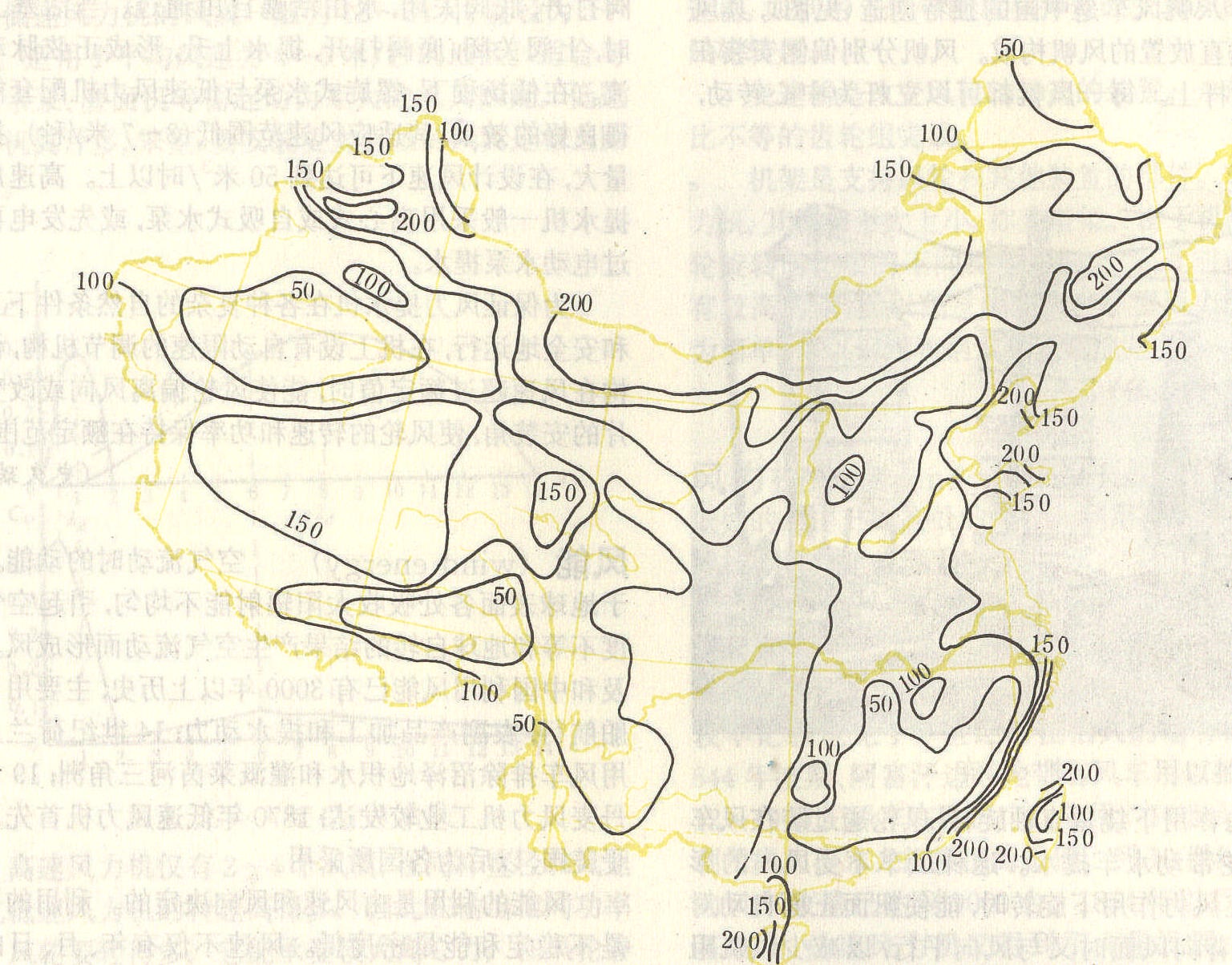 图1 中国风能有效能量密度分布图(瓦/米2) 中国风能丰富区主要分布在东南沿海、内蒙阴山山脉以北的广大地区、松花江下游地区、山东半岛和辽东半岛的沿海,以及内陆的一些山口峡谷地区,如新疆的达板城、阿拉山口等,仅占全国面积的8%。较丰富区分布在东部沿海、三北(东北、华北、西北)地区的北部以及青藏高原的北部,约占全国面积的18%。可利用区的面积约占全国总面积的50%,这一地区在冬半年风速较大, 夏半年风速较小, 亦可称为季节利用区,分布在辽河下游、黄河、淮河流域、长江上下游以及广东、广西沿海、青藏高原东北部和南部、南疆大部和大兴安岭地区。贫乏区以四川为中心向外扩展,包括陕西南部、湖北和湖南的西部、云贵高原的一部分,以及广西、广东、福建的山地,雅鲁藏布江河谷和塔里木盆地。 风的能量计算 按动能公式计算如下: