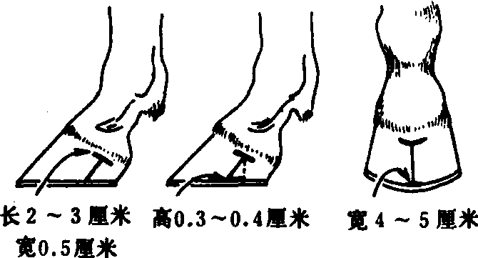 治疗 原则是消除始点裂痕,切断裂端与健康角质的联系,减少对裂缝的压迫,制止裂缝活动。❶造沟法:主要适用于浅层裂或深层裂的不全裂。为防止裂缝继续延长,可在裂缝两端或延长端造沟。沟长约15~20毫米,宽约5~8毫米,深度可至裂缝消失为止。也可在造沟内和裂缝内涂消炎软膏。由负缘向上的纵裂,为减轻分裂部的负重和冲击,可在裂缝下的蹄负面与蹄铁之间削出空隙,即削去深3~4毫米,蹄裂缝两边各2毫米负面角质,在裂缝下端形成一个长方形缺口,使该蹄负面不与蹄铁接触,可使裂缝不再延长而闭合,将部分体重由病部移向健部(图1)。