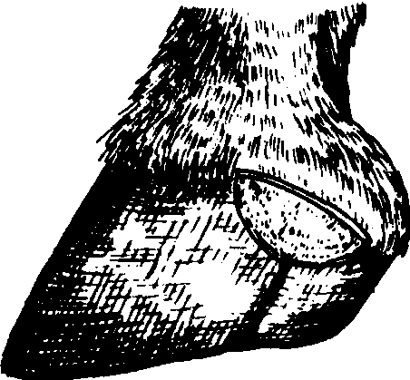 ❷刮削法:也称薄削法。主要适用于蹄冠及全长裂的全层纵裂。当蹄冠部发生全层纵裂时, 应把蹄冠削薄以消除裂开的角质起源。临证上在蹄冠部向下的裂缝往往采用刮削法, 切断新生角质和裂开角质的联系。其方法是: 先剪除裂缝上端的蹄冠毛, 用温水软化角质, 以蹄刀将裂缝角端削刮成半圆形, 弓背向下, 由周围向中央渐次加深, 削到裂缝消失为止。要尽量不损伤真皮, 刮削后用碘酊消毒, 局部可涂消炎软膏,后用绷带包扎。对蹄壁中部开裂的纵裂, 也可以用刮削法。陈旧的风蹄,常伴发角壁肿,压迫蹄壁及真皮小叶,引起慢性跛行。如采用刮削法则可减轻内侧角质对真皮的压迫(图2)。