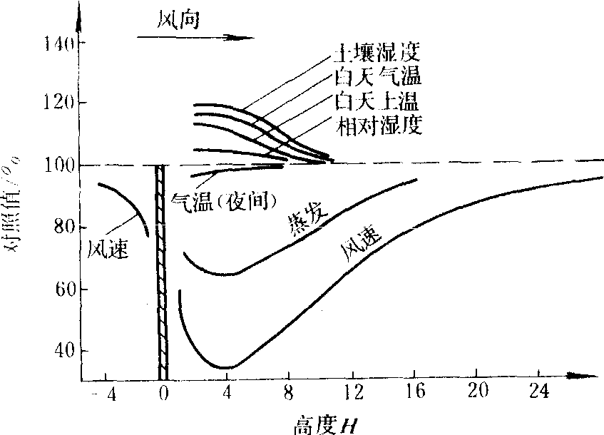 | 释义 | 风障地小气候fengzhangdi xiaoqihoumicroclimate in windbreaks农田中设置风障后,在受风障保护的地段所形成的保护地小气候。由于风障对气流的阻挡和破坏, 以及对太阳辐射的吸收、反射和遮蔽, 使风障前后的动量交换、辐射平衡、热量平衡有所改变, 形成下风侧障内区域的风速与乱流较障外减弱、温度增高、蒸散减小等小气候特征, 如图所示。在多风地带,风障有利于防止作物倒伏和土壤风蚀。在风障保护下, 可以延长作物栽培期, 促进作物生育, 提高作物对水分的利用率,使作物早熟增产。风障结构(风障的疏密度、方向、高度、宽度、与地平面的夹角、风障的间距、大小配套等) 与风障的防风效应有密切的关系。