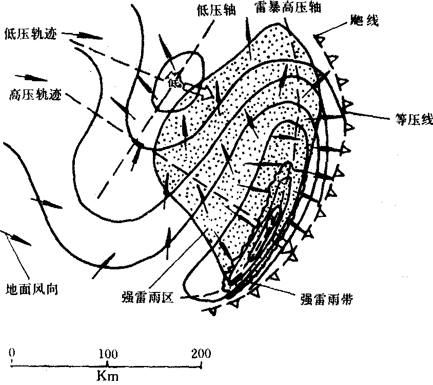 | 释义 | 飑线biaoxiansquall line一种突然发生的风向急变,风速猛增的强风天气现象(见风),也是呈带状排列的中尺度天气系统。飑线过境时气温骤降,气压陡升,并常伴有雷暴、阵雨或冰雹等现象。因其具有冷锋过境的天气特征, 曾称之为伪冷锋、阵风前沿线、风向切变线、气压涌升线、不连续线、不稳定线等, 又叫飑锋。但它比冷锋天气更为剧烈。例如1974年6月17日强飑线经过南京,测得最大风速达38.9米/秒,气压在45分钟内陡升约8百帕,气温在15分钟内下降约11℃。飑线是中尺度天气系统,长度一般为二、三百公里,生命期为几到十几小时,过境时的猛烈天气为时短暂,各项气象要素几小时后基本恢复到过境前的状态。