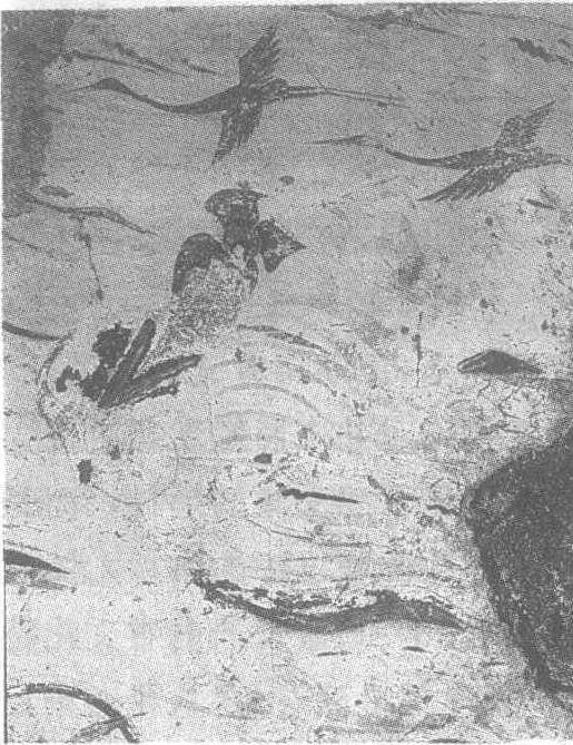 | 释义 | 飞天与双鹤图壁画北魏。甘肃省天水市麦积山石窟第154窟顶部壁画。此图的飞天虽已模糊不清,但其美丽的轮廊依然可辨黑发梳成漂亮的高髻,脸的轮廊清秀典雅。身体着长裙,飞舞的姿态优美动人。所有这些均根据残存的印迹看出。这隐约可现的形体为人们展现了充分的想象空间。飞天的头顶上部有振翅高飞的双鹤,尖喙长长的外出,长颈及身体显现出柔和优雅的弧度,后展的双腿匀细而有力度。作者充分把握了双鹤高速飞翔时身体轮廓的勾画,运笔果断、熟练,通过简单的笔画将双鹤的神似表现了出来,与下部的飞天相配,真是如入仙境。