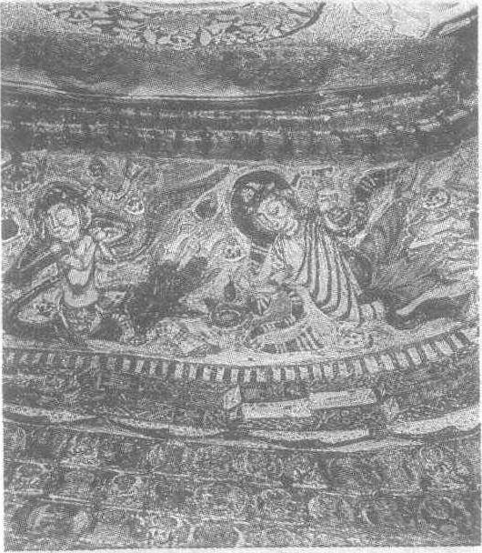 飞天像壁画北凉。纵40厘米,甘肃省肃南裕固族自治县文殊石窟千佛洞窟顶壁画。飞天或斜披珞𤥿,或裸露上身,长裙裹腿,露双足,身材匀称,脸上露出愉快安闲的表情。从其侧身翘脚的姿势看,显系在天空中自由的飞翔,具有音乐和舞蹈的韵律。飞天的面部及裸露的身体以红褐色施晕染,其绘法受西域的影响较大。敦煌莫高窟十六国时期壁画中的飞天形象有与此类似者。