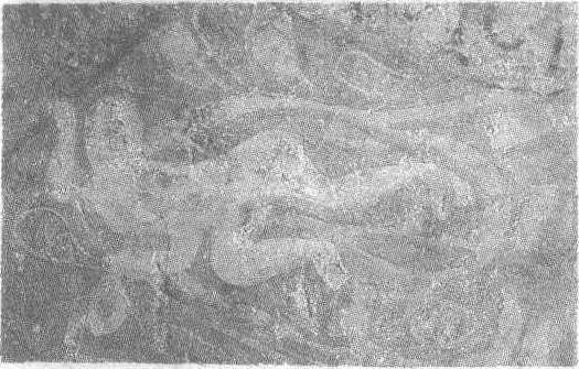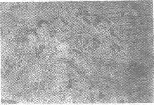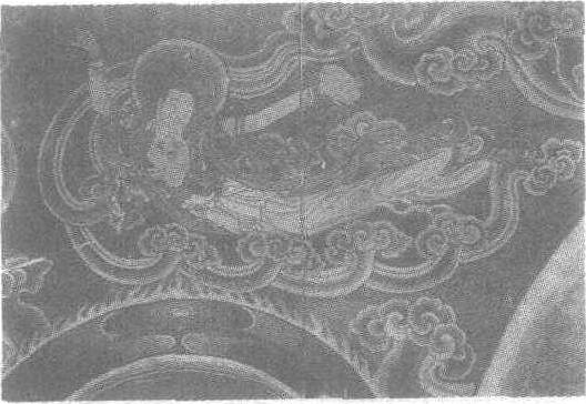 飞天图壁画隋。纵18厘米。甘肃省永靖县炳灵寺石窟第8窟顶藻井内壁画。飞天绕莲飞舞,其姿态宛如游龙,健美潇洒。作者以绿色涂底尤如澄明的碧空。人物以白色平涂,淡墨勾勒,全身裸露,身披的长长飘带随着她的飞翔而高高地飘起。整个形象显得十分自由活泼,富于青春之美。在佛教绘画中,这种全裸的形象是不多见的。