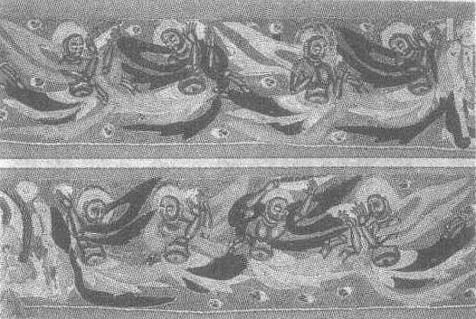 飞天图壁画北周。纵30厘米,横255厘米。甘肃省敦煌县莫高窟第290窟中心柱东龛上壁画。在一佛四弟子说法图(即鹿野苑初转法轮)的两侧各绘飞天四身,背景为天蓝色,代表湛蓝的天空。八身飞天裸上体,束长裙,肩绕以长巾,形体健壮有力,给人以青春的美感。飞天色彩浓重,鲜红的长巾和蓝色的背景色彩对比强烈。肢体和脸庞上有白线绘出的高光,以表示人物的立体感。这样广泛的勾勒高光,在莫高窟壁画中并不多见。飞天的周围点缀着天花,分布着流云,使画面更显活泼、生动。