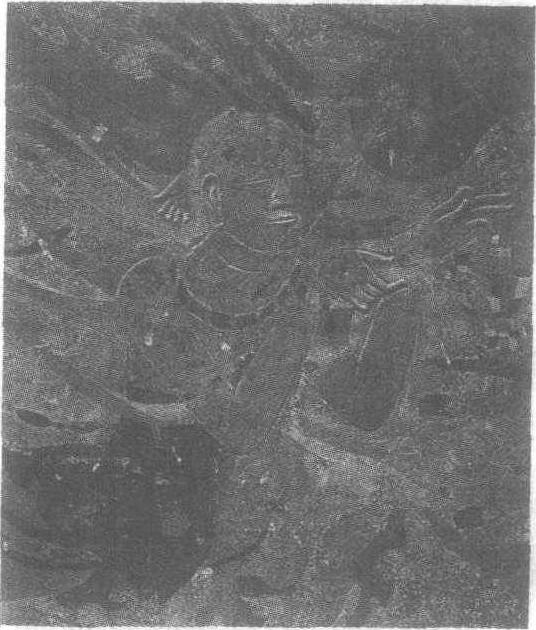 飞天图壁画北周。甘肃省天水市麦积山石窟第4窟第4龛龛楣上方壁画。此身飞天面形丰圆,脸部线条柔和,细目、鼓鼻、薄唇,面带一丝微笑,开朗而纯洁。颈戴粗大的项圈,衣带飞扬,双手前伸,手姿优美,肌肤富于弹性,给人以青春健美的感受。此飞天形象可爱,在制作上又有突出的特点,它是我国现存壁画中,唯一使用绘塑结合的方法制作的一组独特艺术形象中的一位。其面部,如眼、耳、鼻、口及身体的裸露部分,双手、双臂等皆用一层薄薄的细泥塑造,而衣裙、飘带及身边的流云等皆用彩绘而成,这样制作的飞天立体感强,具有脱壁欲出的艺术效果;而衣裙、飘带潇洒飘逸,充分发挥了彩绘的特点,产生很强的动感。这种绘塑结合的作品是北周壁画中的杰出之作。