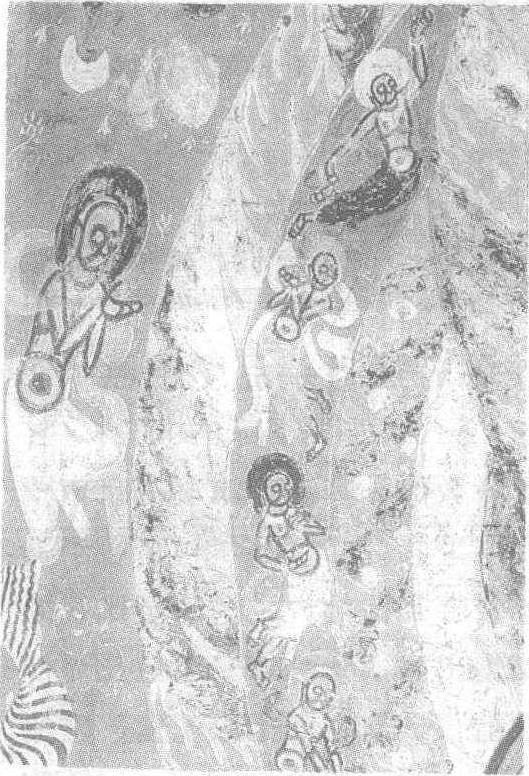 北凉。纵65厘米,横44厘米。甘肃省敦煌县莫高窟第272窟。此为绘于西壁主尊背光上的部分飞天。这组飞天面相丰满,上身裸露,健康而富有弹性感。披巾环绕,腰围长裙,姿态优美而动人。因绘于背光的弧形画面内,其升腾、飞翔之态尤具魅力,富有韵律感。飞天的形体以粗线条晕染,具有粗犷豪放的风格。