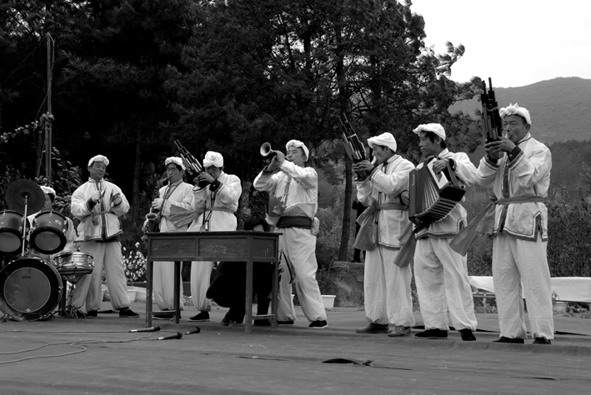 | 释义 | 乐班yuebɑn民间传统丧葬习俗。旧时流行于武功县一带。明康海《武功县志》记载有“乐户”,后世或称“乐班”。当地民间遇有丧葬喜庆事,一般都要请乐班,俗称“乐”。一个乐班少则四人,有四至六种乐器,多则八人,有八至十种乐器。以唢呐为主,打击乐器有锣、鼓、钹等,管弦乐器有笙、笛、萧、喇叭、胡琴、月琴、琵琶等。民间乐手擅长演奏的乐曲如《柳生芽》《对美人》《普天乐》《百鸟朝凤》等。20世纪70年代后,凡八个乐工的普遍都带有六至十人的自乐戏班,演奏与唱戏相配合。武功镇菜园村刘家乐工班为世代相传,历代兼有迎送官员、祭祀文庙等职责,保留曲目有《滚龙袍》《什样锦》等。