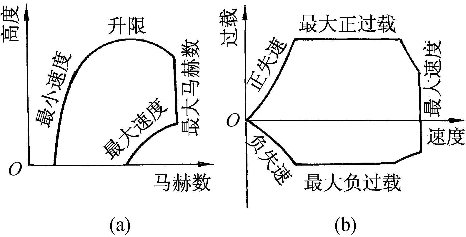 以飞行速度、高度、过载、环境温度等参数为坐标,表示飞机飞行范围和飞机使用限制条件的封闭几何图形。民用运输机使用以下几种飞行包线:❶平飞速度包线,主要给出不同高度所允许的平飞最大速度和最大马赫数,如图(a)所示。❷速度过载包线,主要给出不同飞行速度时对应的最大允许气动过载,民航运输机在增升装置和起落架收起时最大过载为+2.5和-1.0,如图(b)所示。❸突风过载包线,给出遇到突风时不同飞行速度允许的最大过载。❹飞行高度与环境温度包线,给出不同飞行高度时飞机允许飞行环境温度范围。通常民航运输机最高为标准大气温度-14℃,最低约为-75℃。飞行包线给出飞机在使用时速度、载荷、温度等方面的限制范围,是飞机安全使用的重要依据。