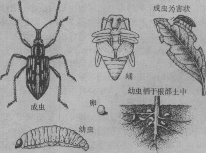 茶丽纹象虫 生活习性 一年发生1代, 多以老熟幼虫在茶丛树冠下土中越冬。在福建东北部, 3~4月间越冬幼虫陆续化蛹, 4月中、下旬成虫相继出土, 5月为害较盛。在安徽南部, 4月下旬开始化蛹, 5月中旬成虫开始出土, 6月盛发,直至8月上旬仍可见少数成虫。在浙江杭州, 成虫初见于5月中、下旬, 一般终见于8月上旬, 高峰在5月下旬~7月上旬。成虫上午羽化,先在土中潜伏2~3天后出土。夜晚至清晨很少爬动, 露干后开始活动, 中午前后多潜伏荫蔽处, 14时后又渐趋活跃, 昏暗后再行减弱。为害新梢嫩叶, 自叶缘食成许多半环形缺刻, 严重时仅留主脉。全年以夏茶受害最重。有假死习性, 稍受惊动即坠地, 片刻后再行上树。善爬行, 但飞翔力弱。采摘、田间管理等工作中,人畜、工具的携带均可帮助其传播。交尾多在黄昏至晚间进行, 交尾次日雌虫陆续入土将卵散产于土中或落叶下, 也有数粒产在一起, 以表土中为多。树冠高大, 生长良好的茶园, 往往虫口较多。 防治 成虫盛发初期, 利用假死习性, 进行人工震落扑杀, 或喷施90%巴丹1 200~1500倍液。 大绿象虫 又名绿鳞象甲, 绿绒象虫。 分布与为害 中国各主要产茶省均有分布。越南、柬埔寨、印度尼西亚等国亦有发生。成虫咀食新梢叶片, 除茶树外还为害油茶、棉花、柑桔、柠檬、咖啡、桑等。 形态 成虫体长12.8~15.1毫米, 宽4.8~6.0毫米,略呈纺锤形,体黑色, 均匀密披绿或蓝绿色鳞片,并带有金属闪光。鳞片间散布银灰色长柔毛(雄)或鳞状毛(雌), 鳞片表面常附有黄粉。但也有鳞片为灰色、珍珠色,褐色或暗铜色, 甚至蓝色的。头管背面扁平,中间有一宽深的中沟,长达头顶, 两侧各有2条浅沟;触角粗短, 柄节长达复眼中部; 复眼突出。前胸基部宽, 后角尖, 前角在眼后突出成一短而尖的刺。小盾片三角形。鞘翅以翅肩附近最宽, 宽于前胸基部,向后渐窄。 生活习性 一年1代, 以老熟幼虫或成虫在土中越冬。成虫常在6、7月间发生最多, 咀食叶片, 有群集性和假死性, 飞翔力弱, 卵散产。靠近山边、杂草丛生的茶园发生一般较多,且常以茶园四周受害较重,新植茶园常比熟地茶园为害重。在广东, 新植扦插茶园可因此虫为害而使植株死亡。 防治 见茶丽纹象虫,并注意清除杂草。 |