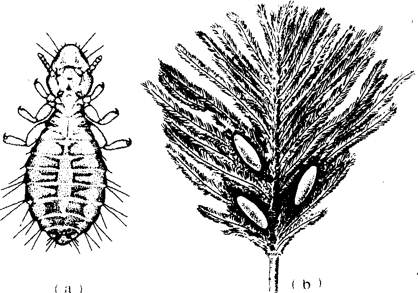 习性 一般寄生于鸟类,少数寄生哺乳动物体外,取食羽毛和皮肤及其分泌物等,利用锐利的上颚咀嚼,但不直接吸取血液。被寄生的鸟类羽毛脱落,死后的鸟体上的羽虱尚可生存2小时至3天。一年发生多代,世代重叠。卵长椭圆形,粘附于寄主羽毛或毛的基部(图b),一般经2~4天孵化。若虫3龄,约3周达到成虫期。寄主有鸡、鸭、鸽类以及犬、猫、马、牛等,野生动物寄主已知有熊、野猪、鹿、海狸等。本目若干种类为畜牧业重要害虫。 食毛目Mallophaga俗称鸟虱、羽虱。昆虫纲,有翅亚纲。成虫体小,长0.5~6 mm,扁平。头大,触角短,3~5节;复眼不发达,无单眼;具特化的咀嚼式口器。无翅。足攀登式,跗节1~2节,爪1~2个。无尾须及产卵器。渐变态。卵粘附于鸟兽毛的基部。多数栖息于鸟类体上,少数栖息哺乳类动物体上,以寄主羽毛、皮肤及分泌物为食,是家禽的重要害虫。已知3 000余种,中国已记载120种,常见种有鸡虱〔Menopon gallinae (L.)〕,寄生于鸡、鸭、鹅等家禽;牛虱〔Trichodectus bovis (L.)〕。