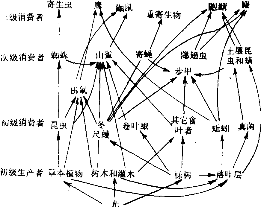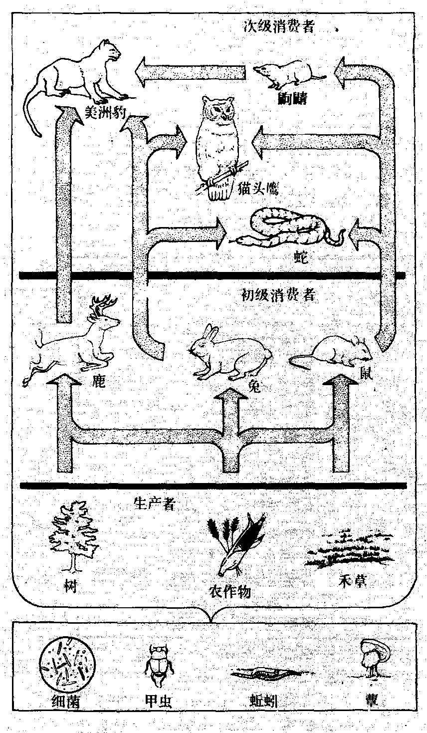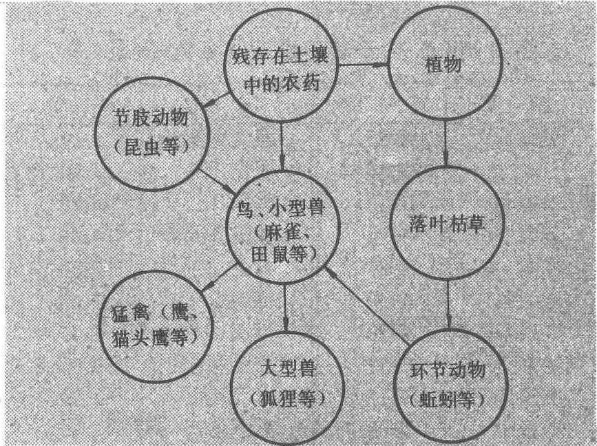 图2 陆生生态系中生物富集与食物链示意图 除了水生生态系存在生物富集与食物链关系外,陆生生态系也同样如此。生活在被农药污染的土壤中的蚯蚓,在取食了土壤及含有农药的枯叶后,在其体内把土壤环境中的农药含量浓缩了数十倍,然后处于陆生生态食物链中更高位置的动物,再逐级进一步富集(上页图2)。 食物链food chain生物群落中生物之间的链锁式营养关系。中国战国时代的哲学家庄周(约前369~前286)在《庄子·山木》中记载了这种有趣的现象: (蝉)“方得类荫,而忘其身,螳螂执翳而搏之,见得而忘其形,异鹊从而利之。”若干个食物链,因错综复杂的营养关系,而构成的网络结构,叫做食物网(food web)。食物链这一术语由美国谢尔福德(V.E.Shelford,)于1913年提出。