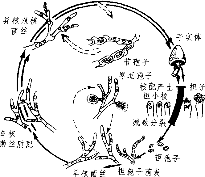 | 释义 | 食用菌生活史lifecycle of edible fungi食用菌一生所经历的周期。即由孢子(担孢子或子囊孢子)→单核菌丝→双核菌丝→孢子的生活循环过程。孢子在适宜的温湿度条件下萌发成单核菌丝后,两个同宗或异宗的单核菌丝就进行细胞质融合(质配),形成双核菌丝。双核菌丝进而扭结发育成原基,原基逐渐膨大成菇蕾,最后分化为菌盖、菌柄。处于子实体部位的某些双核菌丝细胞(原子囊或原担子细胞),两核开始合并(即核配)成为一个合子。合子形成后很快进行细胞分裂,一个合子进行一次减数分裂及1~2次有丝分裂,染色体又减半,一个子囊或担子细胞又发育成4或8个单倍染色体孢子。当子实体成熟时,孢子即从子实层上弹射出来,又开始了新的一代。