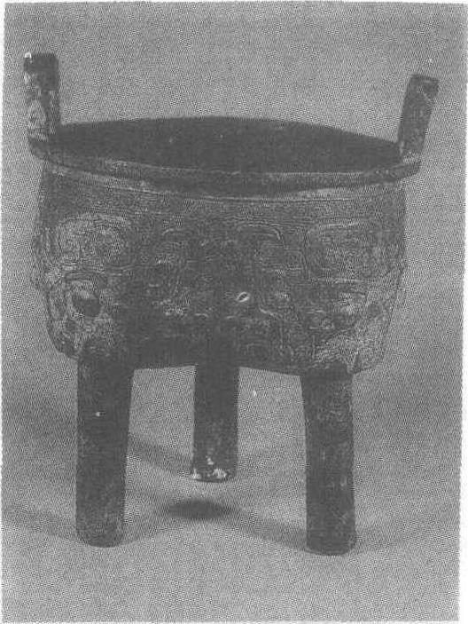 西周。炊器,礼器。高22厘米。台北历史博物馆藏。腹底分三裆,三柱足,口沿立环耳一对。腹部饰饕餮纹三组,侧有夔纹,地纹填空。足、耳均无纹饰。此鼎为西周前期器。