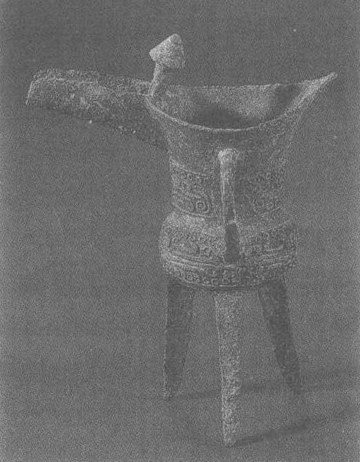 | 释义 | 饕餮纹单柱铜爵商。通高18.7厘米,流尾长14厘米。1954年河南省郑州市杨庄出土。河南省博物馆藏。爵,古代饮酒器,盛行于商及西周初。此爵长流而尾短,有一菌形柱分叉立于流口正中,柱顶作圆锥形,上饰涡纹。细鋬,折腹,腹下部膨出,形成双层腹壁,底近平,三棱尖锥状实足。腰、腹饰联珠、饕餮纹带。爵多为双柱,单柱爵在商代铜爵中比较少见。此爵为商代前期遗物。