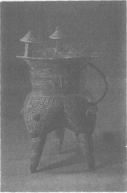 | 释义 | 饕餮纹袋足铜斝商。通高31.1厘米,口径18.5厘米。重1.85公斤。上海博物馆藏。斝是酒器,用于裸酒祭祀,也可作为日常盛酒器。斝的型制起源甚早,早在龙山文化和二里头文化中均有陶斝出土,二里岗时期陶斝也很普遍,但所出土的青铜斝中,袋腹斝甚为少见。此斝侈口,高方柱,柱帽作草帽形,上饰涡纹。高颈上饰饕餮纹带,上下夹以联珠纹。有像鬲一样的袋腹,上满饰具有弯角的饕餮纹,饕餮有一向上卷的驱体,双目特大,带有神秘感。这种双目极度夸张的饕餮纹,后来在殷墟前期曾风行一时,此为其滥。不仅如此,这种袋腹也是为了扩大受火面积,所以斝也有温酒的作用。此器形体虽高大,口沿上有一周加厚的边,但器壁仍很薄,器壁单薄是早期青铜器铸造的一个特点。然而从口沿上的一对帽形柱和足尖也较发达,以及纹饰布满全身这一特点来看,该器的年代可能较常见的二里岗期器物略晚。