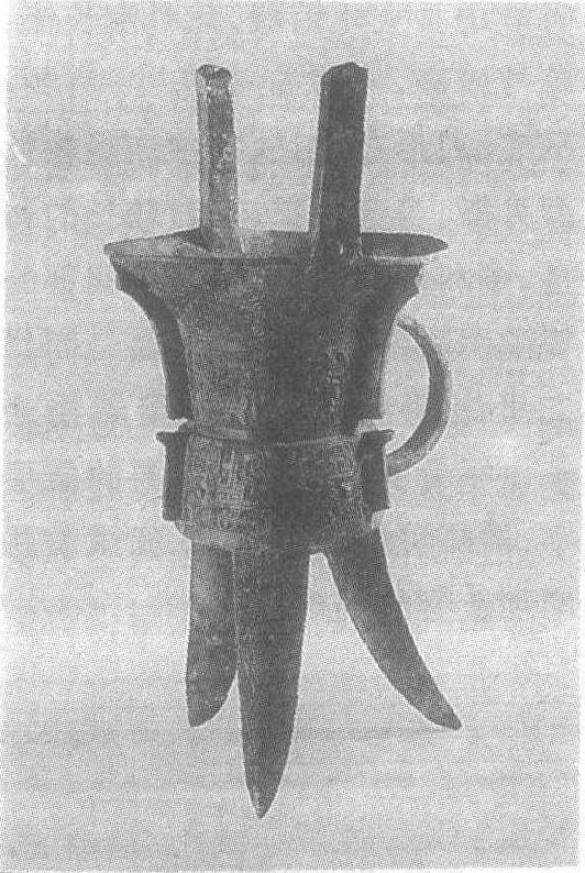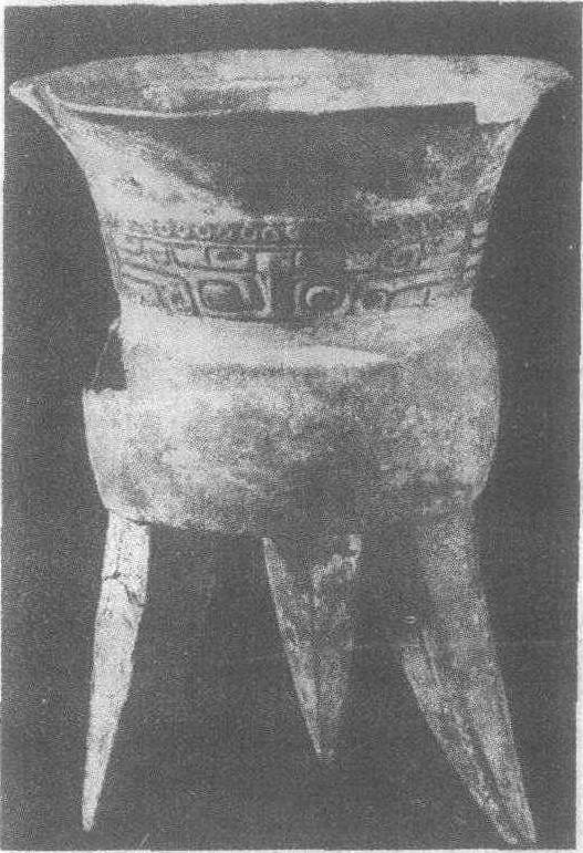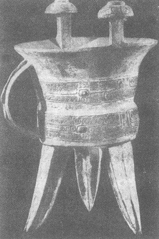 饕餮纹铜斝商。古代温酒器。通高57.5厘米,口径27.5厘米,腹深25厘米。重9.8公斤。1959年陕西省城固县苏村出土。陕西省博物馆藏。此斝侈口平底,三棱锥足。方柱高耸,从柱顶断痕看,原应铸有饰物。通体起棱脊。腹部纹饰分为两段:上段为垂冠回首不分尾的鸟纹;下段是以云雷纹为地的饕餮纹。口沿饰阴线鸟纹,两两对峙,尾部上卷。足面饰阴线夔龙一对。此斝器体巨大,气魄雄伟,纹饰繁丽,是商代晚期青铜器中的一件豪华铸品。