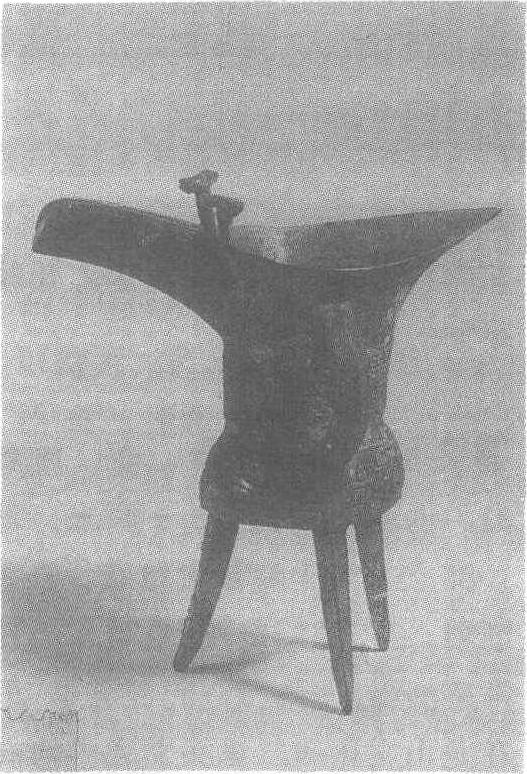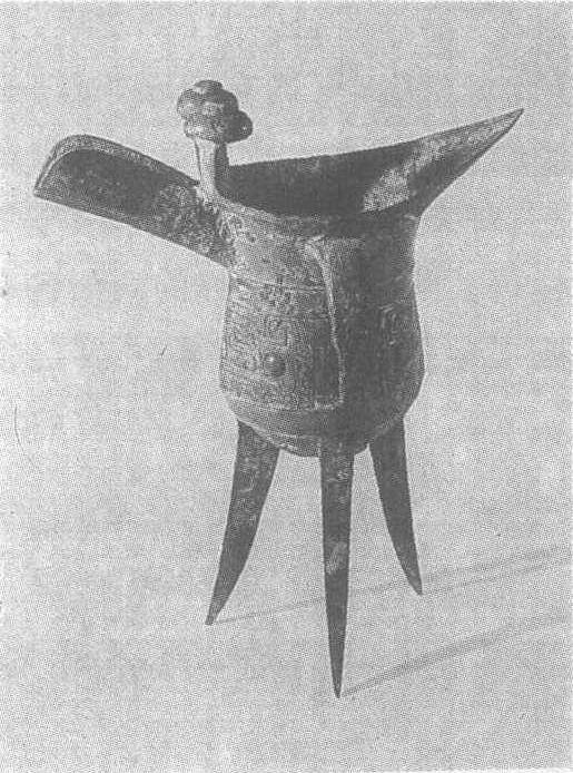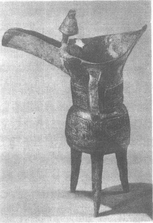 饕餮纹铜爵商。饮酒器。通高21.9厘米,长25.3厘米,腹深10.5厘米。重0.57公斤。1972年陕西省岐山县京当村出土。陕西省岐山县文化馆藏。此爵窄长流,单柱较高,分岔立于流口。直颈,平底,刀形之锥足,其中一足较长而外撇,身旁一鋬,正对较长的一足。颈和腹部均饰饕餮纹,腹部的饕餮用联珠纹镶边。此爵是商代二里岗期青铜器的典型器物之一。甲骨文、金文中有爵的象形字。爵流可倾酒,爵尾平衡重量并增加造型的美观。