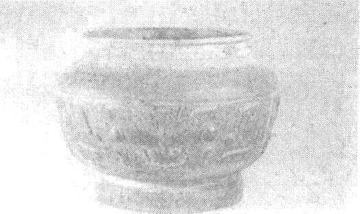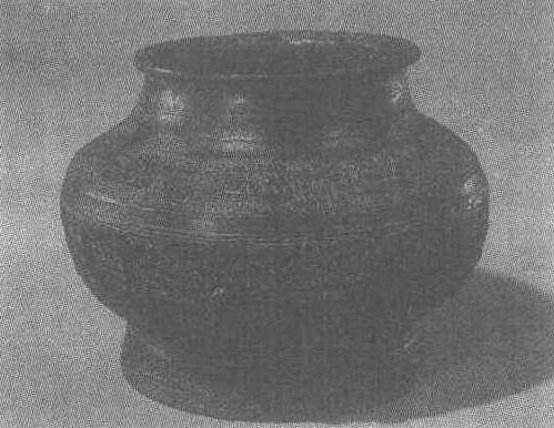 饕餮纹铜瓿商。盛水、酒器。高27厘米,口径26.6厘米。1977年河北省藁城台西出土。河北省文物研究所藏。此瓿方唇,短颈,圆肩,腹下微敛,平底,圈足。口沿下有两道弦纹,肩部饰夔纹带,夹以联珠纹,腹部饰饕餮纹,圈足则为目雷纹。此瓿饕餮纹线条刚劲,双目特大,有粗犷感,为商代晚期之器。