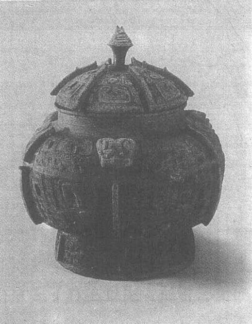 饕餮纹铜瓿商。通高17.5厘米,口径16.3厘米。河南省博物馆藏。瓿是古代盛水或酒的器皿,像现代的坛子,盛行于商至战国。此瓿敛口,圆腹,平底,圈足。肩部饰夔纹,腹部饰饕餮纹,均以细密的云雷纹作地。内底中部铸蟠龙,圈足上饰有斜角雷纹。此瓿当为盛水器,注水入瓿,则龙蟠其中。 饕餮纹铜瓿商。通高42.5厘米,口径23厘米。1959年湖南省宁乡县寨子山出土。湖南省博物馆藏。此瓿有盖,广肩,鼓腹,圈足。盖中间有一提手,提手顶端饰以虎首虺身盘绕的怪兽。自盖至圈足用扉棱将瓿分成六等份,通身以云雷纹为地饰有夔龙纹和饕餮纹。肩部置有三个浮雕兽首。此器出土时,器内置有商代晚期铜斧多件。
