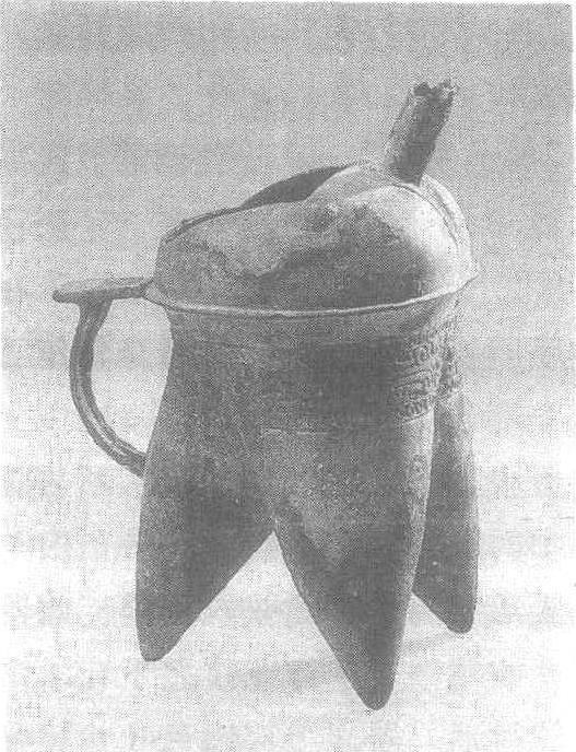 | 释义 | 饕餮纹铜盉商。盛酒器,或酒水调和器。通高18厘米,口径8.5厘米。1977年北京平谷县刘家河商墓出土。北京市文物工作队藏。此盉三个外侈的袋形尖足,有鋬。上有隆起的封口,顶部一长方形口,一筒状流。颈饰流散式的饕餮纹,上下界以圈带纹。为商代早期作品。