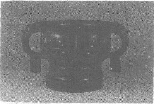 饕餮纹铜簋西周。盛食器,礼器。通高29.5厘米,口径22.4厘米,腹深13.5厘米。重9公斤。1977年陕西省陇县韦家庄出土。陕西省宝鸡市博物馆藏。此簋侈口,方唇,兽首屈舌形双耳,下有垂珥较长,兽耳耸出器口,圈足下附有方座。腹部饰大饕餮,近似浮雕,张口露齿,巨目利爪,神态狰狞。圈足饰夔龙纹。方座亦饰饕餮纹,通体均以细云纹填地。此器造型庄重,装饰富丽,是西周早期一件艺术珍品。 |