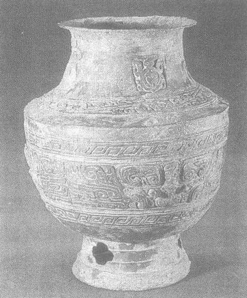 | 释义 | 饕餮纹铜罍商。通高25厘米,口径13厘米。1955年河南省郑州市白家庄二号墓出土。北京中国历史博物馆藏。《说文解字》:罍是“龟目酒尊。”《诗经·卷耳》:“我姑酌彼金罍。”可见罍是古人盛酒的器具。罍也可以用来盛水。《仪礼·少牢馈食礼》:“司宫设罍水于洗东,有料。”此罍口沿外卷,长颈,折肩,深鼓腹,圜底,高圈足。颈饰三处纹图案,肩饰斜角云纹一周,腹部饰饕餮纹,上下夹以雷纹,饕餮面部呈浮雕状,圈足上有三道弦纹和三个十字形镂孔。出土时器表粘有木质痕。罍颈黽纹,有学者主张是铭文,释作“黽”字,黽是一种大蛙,当为某氏族的族徽。但也有学者认为,铭文未见有三处对置者,同时其上尚有涡纹,因此是否文字有待研究。此罍为商代前期的遗物。